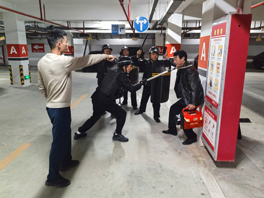 與此同時(shí),應(yīng)急處置崗隊(duì)員也攜帶防暴盾牌、橡膠棍等專業(yè)器械火速集結(jié),以最快速度抵達(dá)地下車庫指定區(qū)域。面對(duì)負(fù)隅頑抗的 “盜竊分子”,隊(duì)員們沉著冷靜,憑借日常訓(xùn)練形成的默契配合,迅速結(jié)成戰(zhàn)術(shù)小組,從不同方向?qū)?“盜竊分子” 實(shí)施包圍,果斷出擊、動(dòng)作規(guī)范,僅用數(shù)分鐘便成功將其治服,并移送公安機(jī)關(guān)處理。